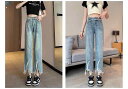 - ダメージジーンズ ワイド レディース 春夏 切りっぱなし クラッシュ加工 ハイウエスト クロップド 九分丈 ストレートパンツ ゆったり カジュアル おしゃれ レトロ 青
