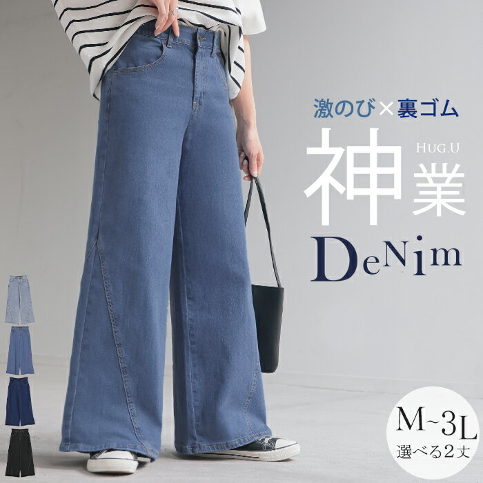 ■パンツ デニム フレア レディース ボトムス フレアパンツ ロング ロングパンツ ワイドパンツ ワイド ジーンズ ジーパン 体型カバー ボトム ストレート ズボン ハイウエスト 伸びる ゴム ストレッチ 美脚 大きいサイズ ブルー 黒 春 冬 HUG.U