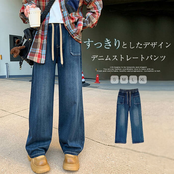 ■デニムパンツ レディース パンツ 春 イージーワイドパンツ ストレートパンツ ワイドパンツ ボトムス ウエストゴム デニム パンツ ストレッチ ロングパンツ ロング丈 春 夏 秋 リラックス 無地 シンプル 着回し ジーンズ ゆるパンツ ゆったり 体型カバー 着痩せ 美脚