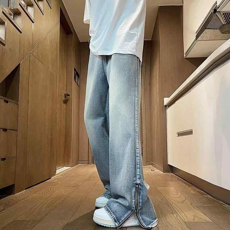 ■メンズ ファッション 服 男性用 オシャレ シンプル 大人 かっこいい 大きいサイズ ストリート 紳士服 夏 ウォッシュド フロア レングス ジーンズ 薄手 ストレート パンツ ダメージ 加工 ワイド レッグ パンツ