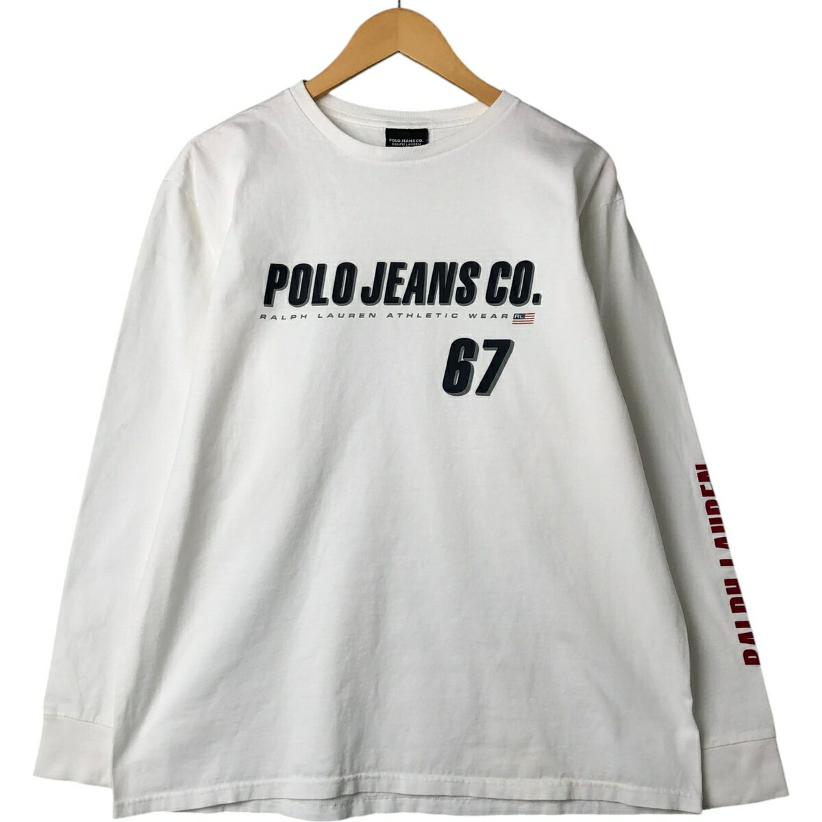 商品詳細 ブランド・Ralph Lauren・ラルフローレン・ 特徴・クルーネック(丸首)・長袖・両面プリント・袖プリント・ナンバリング・ モデル/形状・POLO JEANS COMPANY・ロングTシャツ ロンT・ 素材・コットン:100%・ 色・ホワイト系 白色・ 柄・プリント・ 生産国・ホンジュラス製・ 年代・00年代・ サイズ・メンズXL・表記サイズ:XL・着丈:69.5cm・身幅:60c...