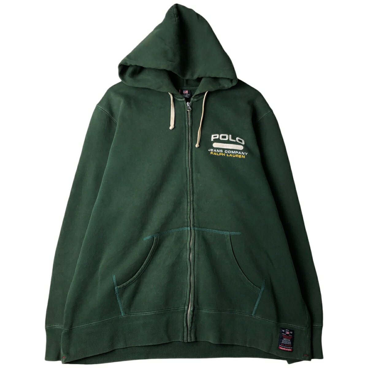 商品詳細 ブランド・Ralph Lauren・ラルフローレン・ 特徴・フルジップ・長袖・ モデル/形状・POLO JEANS COMPANY・スウェットフルジップパーカー・ 素材・コットン:80%・ポリエステル:20%・ 色・グリーン系 濃緑・ 柄・無地・刺繍・パッチ・ 生産国・インドネシア製・ 年代 サイズ・メンズXL・表記サイズ:X-LARGE・着丈:71.5cm・身幅:67cm・肩幅:49c...