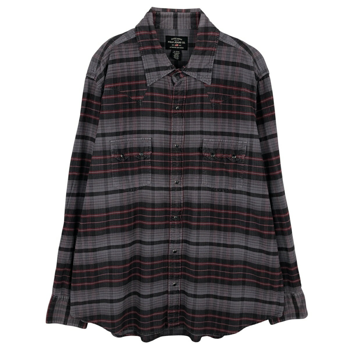 商品詳細 ブランド・Ralph Lauren・ラルフローレン・ 特徴・薄手・レギュラーカラー・スナップボタン・コーデュロイ・ヴィンテージ・ モデル/形状・POLO JEANS COMPANY・長袖 ウエスタンシャツ・ 素材・コットン:100%・ 色・ブラック系 黒色・チャコール・レッド系 赤色・ 柄・チェック柄・ 生産国・香港製・ 年代・90年代・ サイズ・メンズXL・表記サイズ:XL・着丈:80...