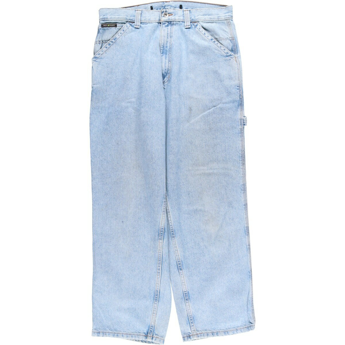 商品詳細 ブランド・DKNY・ダナキャランニューヨーク・ 特徴・ジッパーフライ・ワイドパンツ・ハンマーループ・スパナポケット・ モデル/形状・JEANS・デニムペインターパンツ・ 素材・不明・ 色・ブルー系 水色・ 柄・無地・ロゴパッチ・ 生産国・メキシコ製・ 年代 サイズ・メンズw33・表記サイズ:32×30・ウエスト:84cm・股上:31cm・股下:73cm・もも周り:72cm・裾周り:48c...