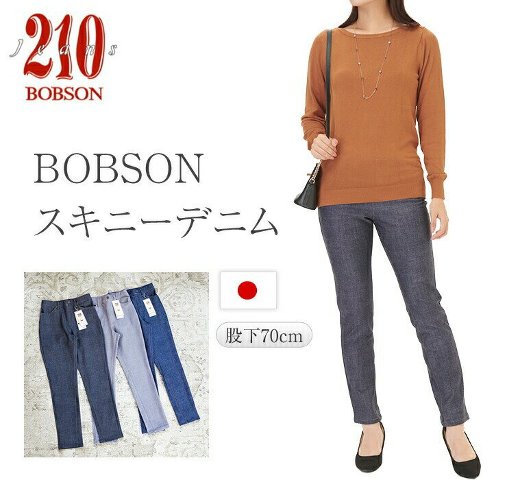 ■BOBSON スキニーデニムパンツ レディース 新品 ボブソン 日本製 スリム ジーンズ ジーパン ウエストゴム 伸びる 股上深い ストレッチ 細見え ロング丈 大人 細く見える 動きやすい 大きいサイズ もあり インディゴ ブラック グレー 4ポケット付 ポリエステル88% 股下70cm