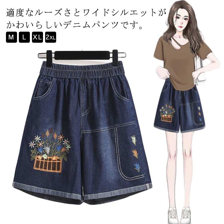■ハーフパンツ ショートパンツ 春夏 花柄 レディース デニム 半ズボン デニム デニムパンツ ウエストゴム 短パン ゆったり ボトムス 大きいサイズ ジーンズ