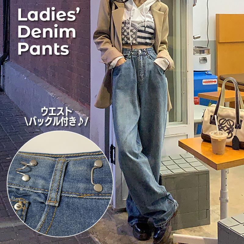 ■デニムパンツ ワイドパンツ バギージーンズ バギーパンツ ウエストバックル付き レディース ボトムス ジーンズ ジーパン 長ズボン ロングパンツ 無地