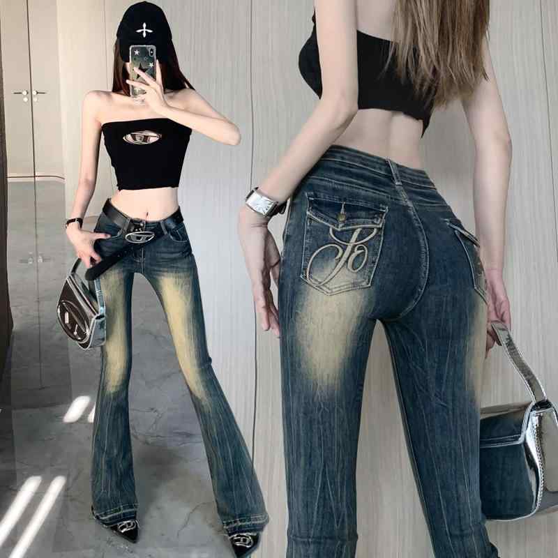 ■ジーンズ レディース ローライズ 裾フレア デニムパンツ ストレッチ スリム レトロ加工 古着風 ジーパン ズボン カジュアル 韓国ファッション
