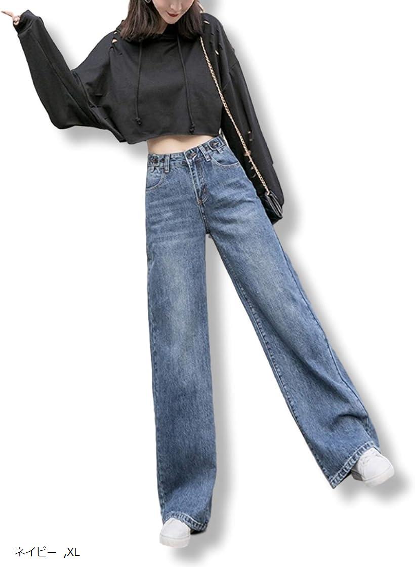 ■カナエルン ストレート デニム レディース ジーンズ テーパード カーブ Gパン オールシーズン ハイライズ ロングパンツ 着やせ ハイウエスト 腰高 ジーパン ボトムス ズボン ストレッチ ロールアップ ストリート (ネイビー, XL)