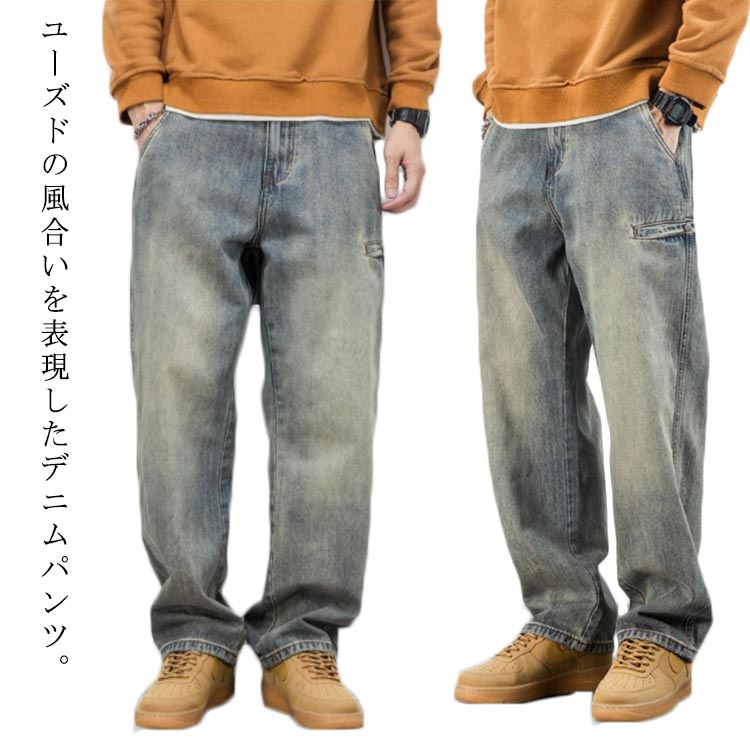 ■ジーンズ メンズ 無地 ユーズド加工 大きいサイズ アメカジ ロングパンツ ワイドパンツ サルエルパンツ ボトムス ワークパンツ カジュアル キレイめ ジーンズ ゆったり ストレート ジーパン