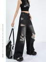 ■ダメージジーンズ ワイド レディース ハイウエスト ストレート ゆったり 春夏 デニム カジュアル おしゃれ クラッシュ加工 黒 ショッピング 旅行
