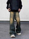■ワイドパンツ メンズ ストリート アメリカン レトロ ダメージ加工 グラデーション ジーンズ ゆったり ストレート ドレープ ロング ハイウエスト デニム ジッパー カジュアル 大きいサイズ 青
