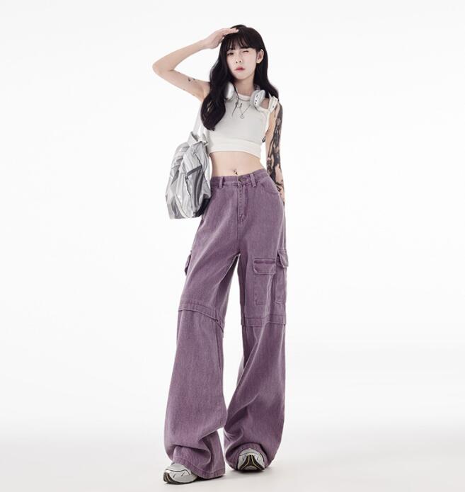 ■レディース デニムパンツ カーゴパンツ 女性 大人 ダンスパンツ ジャズ ヒップホップ ぶかぶか カーゴパンツ デニムカーゴパンツ ジーンズ デニム ストレートパンツ oversize 個性 パンツ パープル
