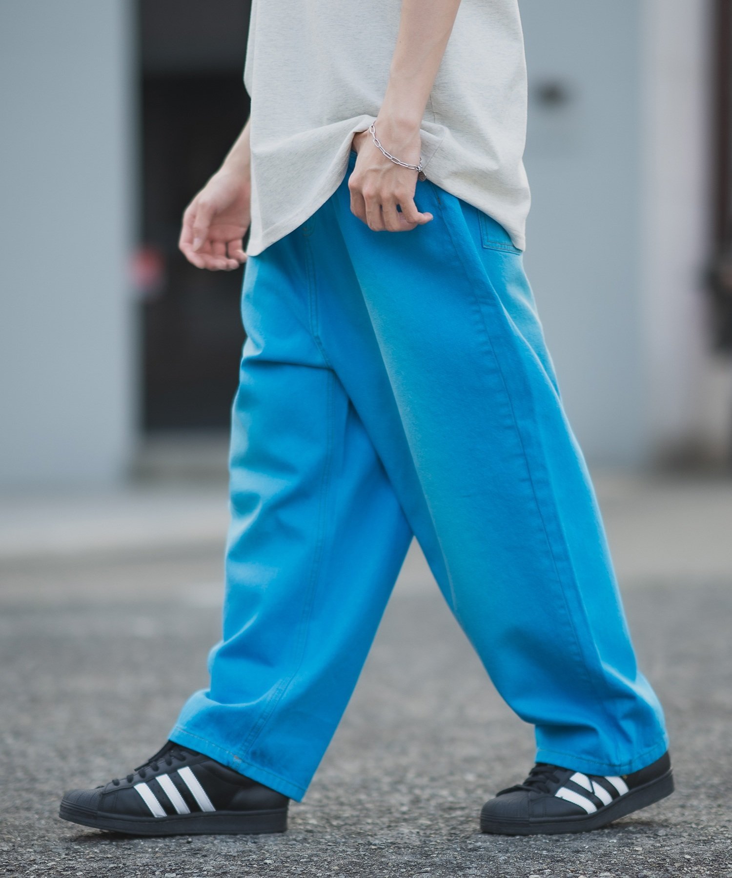 improves(インプローブス)ワイド カラーデニムパンツ自然な色落ち具合とゆったりとしたシルエットのワイドデニム。●USEDのような洗い加工を施したコットン100%のデニム素材を採用●丸みのあるストンと落ちたようなワイドシルエット●ゴムの入ったウエストにドローコードを装備したイージーパンツ●差し色にも使えそうなパープル、グリーンをセレクト特徴的で存在感のあるシルエットでコーディネートのワンポイ...