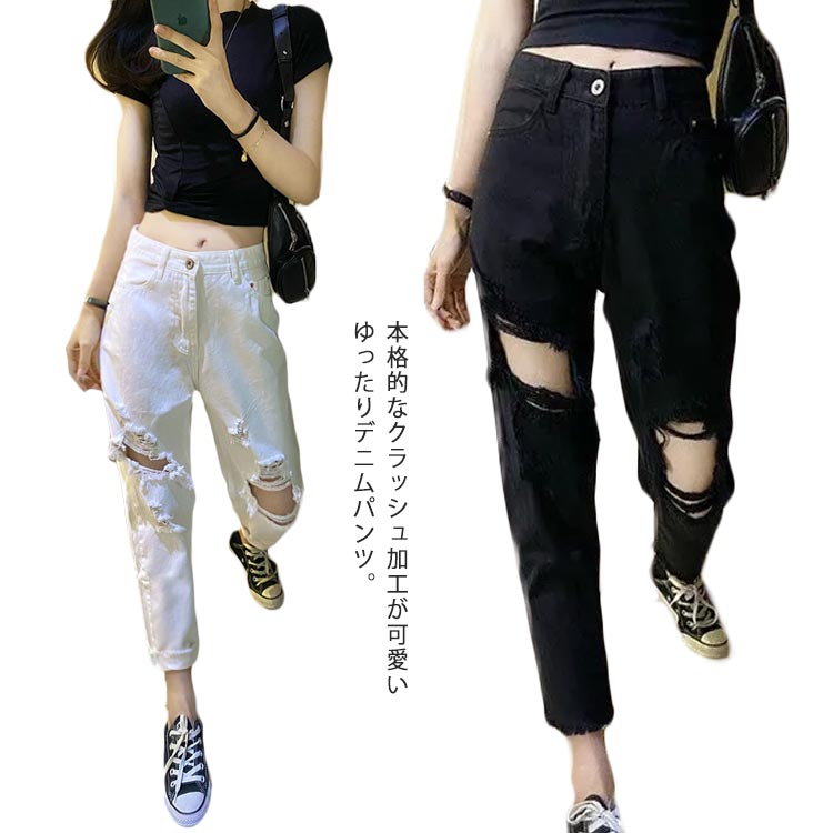 ■九分丈 ブラックデニム ホワイトデニム ブラックジーンズ ホワイトジーンズ ジーンズ デニムパンツ サルエルパンツ レディース カジュアル ボトム パンツ ジーパン 送料無料 クラッシュ ダメージ ハイウエスト ゆったり 美脚 夏